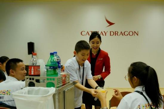 而在客舱服务培训课堂中,国泰港龙航空资深空服人员对学员们进行了机舱服务流程培训,并带领他们亲身体验如推餐车、发放餐食等机上服务工作。在空服员的指导下,同学们用心完成每一服务细节,对于国泰及国泰港龙设想周到、积极求进和尽心尽力的核心服务理念有了更为深刻的领悟。