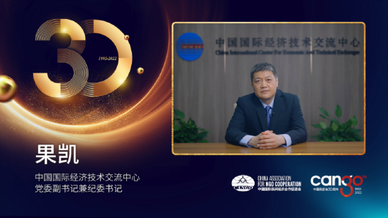 中国国际经济技术交流中心党委副书记兼纪委书记果凯致辞。他指出,作为中国民促会的发起单位和代管单位,交流中心见证了民促会一路走来不平凡的成长过程。民促会的成立具有时代性、开创性和前瞻性意义,三十年来在环境保护、妇女权益、行业人才培养、对外交流等方面做出的促进中外民间合作、促进贫困地区经济社会发展工作中的突出贡献。希望民促会能够深入学习贯彻习近平新时代中国特色社会主义思想,坚守初心,牢记使命,继续发挥平台优势,高起点、高标准、高质量谋划并落实好未来发展蓝图,在提高机构服务能力上再有新作为,在加强治理规范上更上新台阶,在推动业务提质增效上实现新突破。